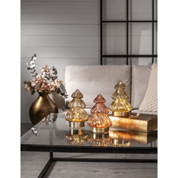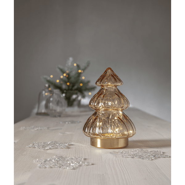 Décoration de table élégante en forme de sapin de Noël en verre transparent beige. Base de couleur dorée qui dissimule le compartiment à piles. Parfait pour la décoration sur la table de Noël. Donne à votre maison une lueur chaleureuse. La décoration dispose d'une minuterie intégrée qui allume les lumières pendant 6 heures et les éteint pendant 18 heures et se répète. Alimenté par 3 piles AAA (non incluses). Durée de combustion environ 80 heures.