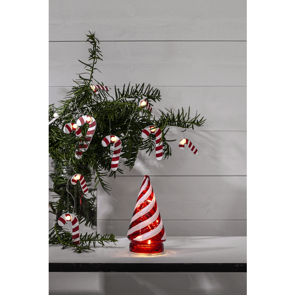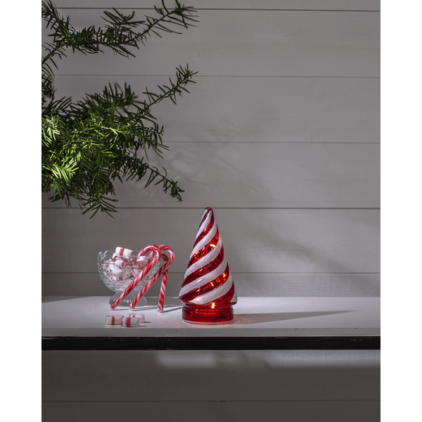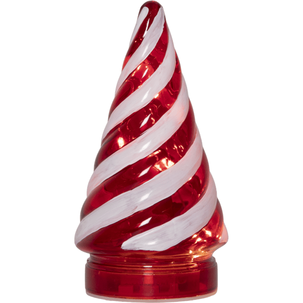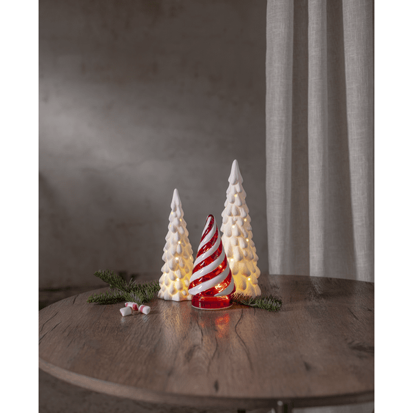 Élégante décoration de table à piles en forme de sapin de Noël, réalisée en verre rouge et blanc. Elle diffuse une belle lumière blanche chaude et est idéale pour décorer votre table de Noël. Elle est dotée d'une minuterie (6 heures allumée, 18 heures éteinte, répétition possible). Fonctionne avec 3 piles AAA (non fournies). Autonomie d'environ 60 heures.
