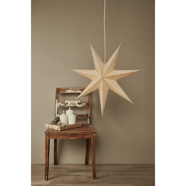 Étoile en papier recouverte de tissu beige pour un effet naturel. Une étoile de l'Avent moderne pour décorer fenêtres et murs. Elle illumine la période de l'Avent et crée une jolie étoile de Noël. Ce produit est certifié FSC®. Système d'accrochage et ampoule non inclus.
