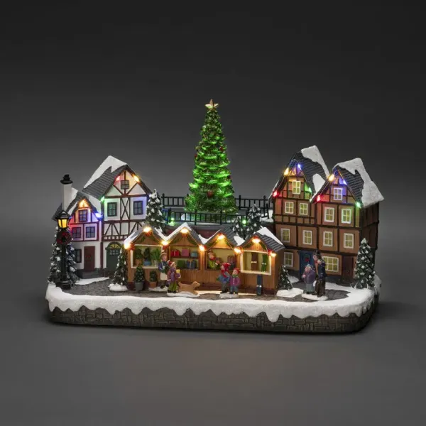 Créez un pays des merveilles hivernal vivant dans votre maison avec ce marché de Noël mécanique ! Avec 28 lumières LED blanc chaud, des maisons enneigées, des étals de marché colorés et un majestueux sapin de Noël au centre, il diffuse à la fois lumière et musique. Une décoration d'ambiance rappelant la magie classique de Noël ! Alimenté par 3 piles AA (1,5 V – non incluses). Transformateur avec câble noir de 1,8 m de long et prise inclus. Éclairage LED intégré.