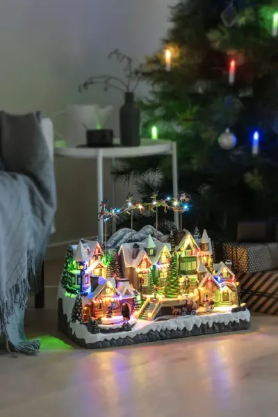 Un magnifique village de Noël avec des pièces mobiles, des trains colorés et 52 lumières LED brillantes qui illuminent chaque détail. Le traîneau du Père Noël flotte au-dessus du village tandis que la musique de Noël joue, créant une atmosphère magique. Parfait pour attirer les regards dans la maison à l'occasion de Noël. Un monde de Noël complet, plein de vie, de lumière et de mouvement. Durée de combustion jusqu'à 8 heures. Alimenté par 3 piles AA (1,5 V), piles non incluses. Transformateur avec câble USB noir de 1,8 m et prise inclus.