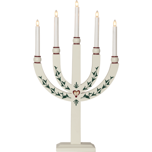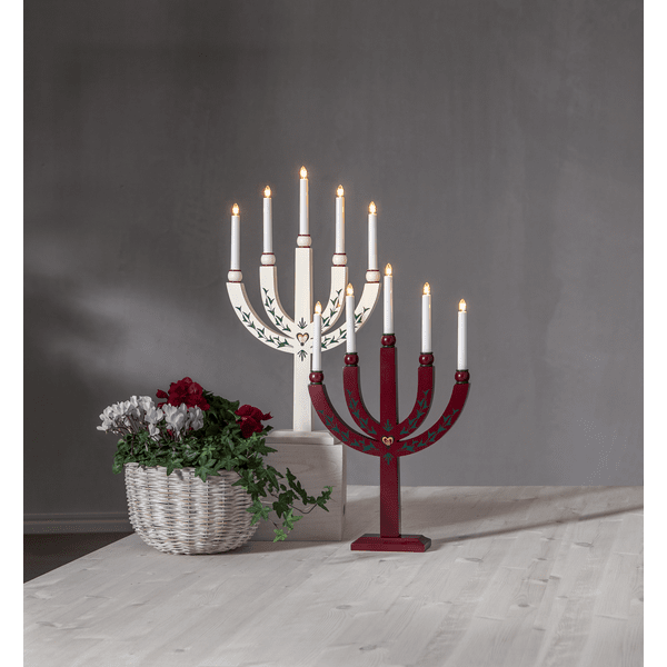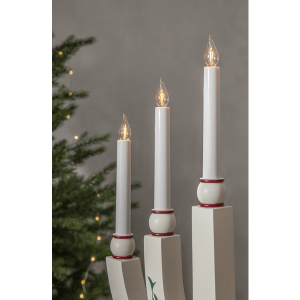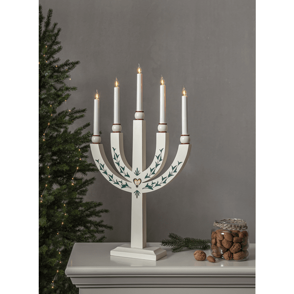 Bougeoir traditionnel en bois avec de beaux détails. Le bougeoir de l'Avent dispose de 5 sources lumineuses qui confèrent au bougeoir un éclairage chaleureux et une atmosphère de Noël chaleureuse. Placez-le dans la fenêtre ou sur une bouteille. Livré avec un câble blanc de 1,8 m, un interrupteur d'alimentation et une prise. 5 ampoules E20 remplaçables incluses (55 V).
