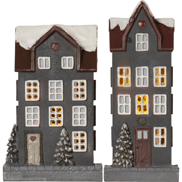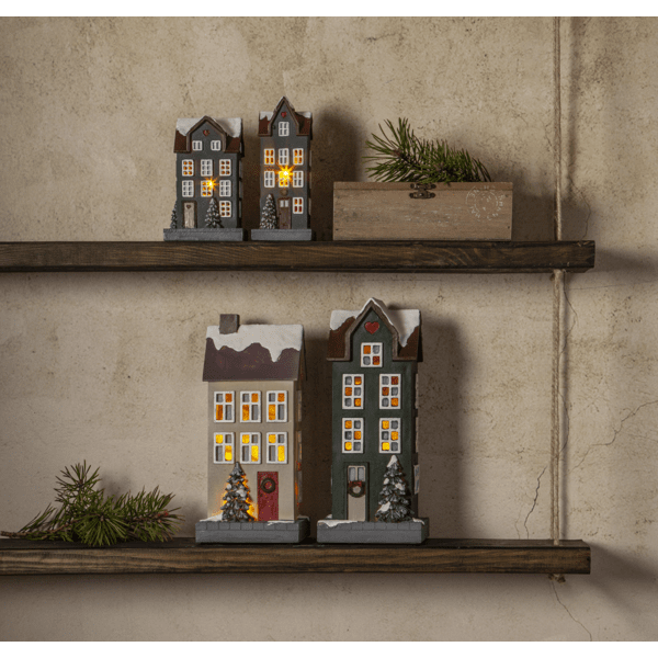 Un ensemble de deux maisons, de 13 cm et 14,5 cm de hauteur. Les deux maisons rayonnent d'une belle lueur jaune chaude à travers les fenêtres. Utilisez-le pour décorer une étagère ou placez-le sur une bouteille. Parfait pour toute la saison sombre et comme décoration d'ambiance pendant l'Avent et Noël. Equipé d'une fonction minuterie, 6 heures allumées, 18 heures éteintes, répétitive. Alimenté par 4 piles AAA, non incluses.