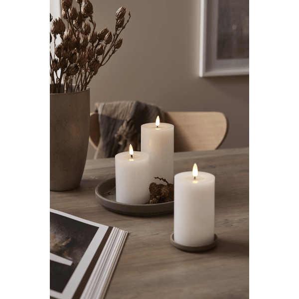 Flamme Flow est une bougie bloc avec la flamme naturelle Flame et une durée de combustion d'environ 10 minutes. 1500 heures. Cette bougie possède un renfoncement brillant sous la base. Cette surface ressemble à de la cire liquide, ce qui donne encore plus de vivacité à la bougie. Cette lumière LED est une belle décoration, aussi bien individuellement qu'en groupe avec d'autres lumières de la série Flamme. Il dispose d'une fonction minuterie et lorsque l'interrupteur est allumé, la lumière brillera pendant 6 heures en mode minuterie, éteinte pendant 18 heures (en répétition), avec une belle flamme réaliste dans une lumière blanche chaude. L'alimentation est fournie par 2 piles AA, qui ne sont pas incluses.