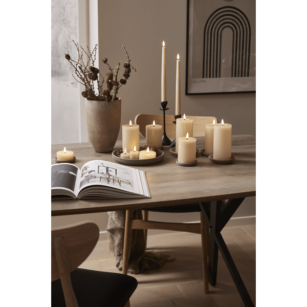 Flamme Flow est une bougie bloc avec la flamme naturelle Flame et une durée de combustion d'environ 10 minutes. 1500 heures. Cette bougie possède un renfoncement brillant sous la base. Cette surface ressemble à de la cire liquide, ce qui donne encore plus de vivacité à la bougie. Cette lumière LED est une belle décoration, aussi bien individuellement qu'en groupe avec d'autres lumières de la série Flamme. Il dispose d'une fonction minuterie et lorsque l'interrupteur est allumé, la lumière brillera pendant 6 heures en mode minuterie, éteinte pendant 18 heures (en répétition), avec une belle flamme réaliste dans une lumière blanche chaude. L'alimentation est fournie par 2 piles AA, qui ne sont pas incluses.