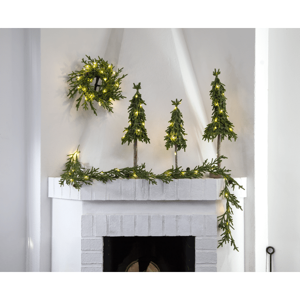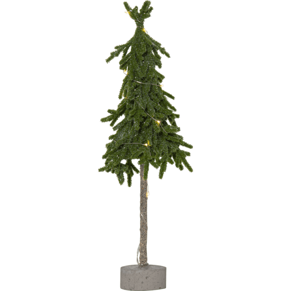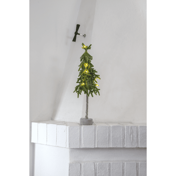 Petit sapin de Noël décoratif à poser, en polyéthylène (PE) avec une touche de paillettes et un socle en ciment robuste. Il est illuminé par 10 petites LED blanc chaud. Placez-le sur une table d'appoint, sous le sapin ou comme décoration sur la table à manger. Un câble de 30 cm relie le sapin au compartiment à piles. Fonctionne avec 2 piles AA (non fournies). Autonomie : environ 200 heures.