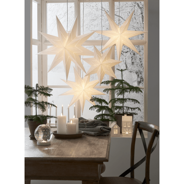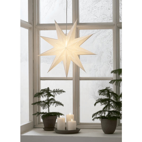 Étoile en papier blanc ornée de perles en forme d'étoile. Idéale pour les décorations de Noël et de l'Avent. Suspendez-en une ou plusieurs à une fenêtre ou au mur. Câble blanc de 3,5 m avec prise. Ampoule non fournie.