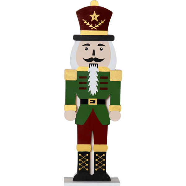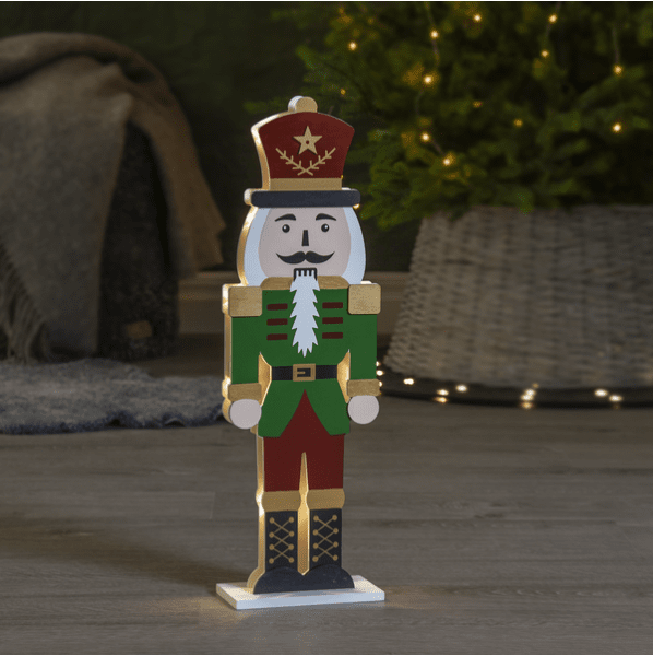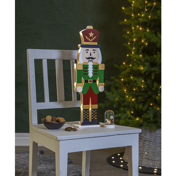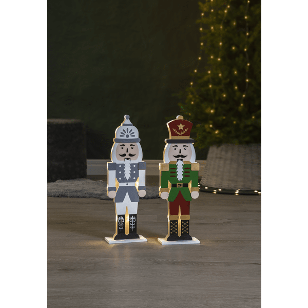 Élégant casse-noisette en bois découpé au laser. La face avant est peinte en rouge, vert, or et noir. De petites LED illuminent l'intérieur, entre les deux silhouettes découpées. Décorez votre bureau ou une étagère avec ce casse-noisette pendant les fêtes de Noël et de l'Avent. Minuteur intégré (6 heures allumé, 18 heures éteint, répétition possible). Fonctionne avec 2 piles AA (non fournies). Autonomie : 1 000 heures.